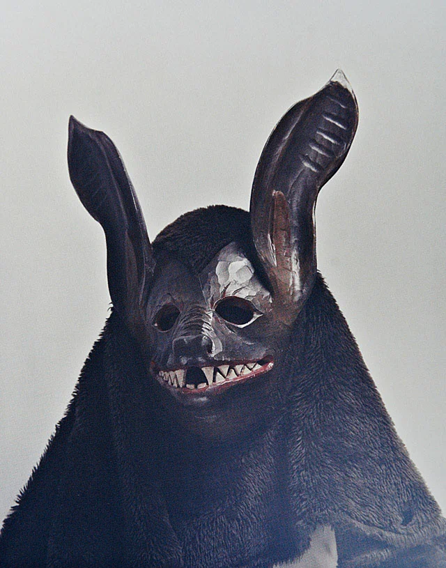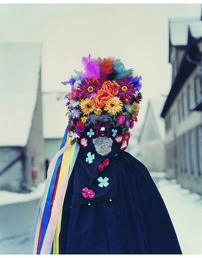 The Fasnacht costumes themselves are both elaborate and unfamiliar, at least for an American audience. Aesthetically, they lie somewhere between artist Nick Cave's Soundsuits and traditional Japanese Noh costumes. While characters vary from a traditional jester to an abstract animal, the wearer’s face is always covered—and almost always by a mask. By replacing the wearer’s eyes with paint or leaving shadowed holes in their place, these masks forbid eye contact with the camera. The masked figures seem to flicker between human and inhuman; for all we know, there may be nothing at all behind those painted pupils.